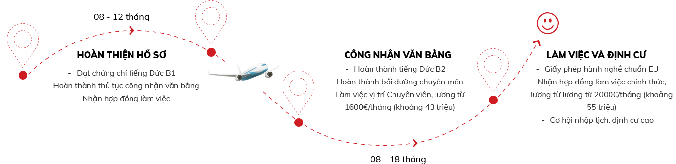 Hoàn thiện toàn bộ hồ sơ, đưa đón khi nhập cảnh, hướng dẫn thủ tục nhập học, nơi ở. Miễn phí lớp luyện thi tiếng Đức, hỗ trợ thủ tục hành chính trong suốt quá trình thích nghi tại nước ngoài.
